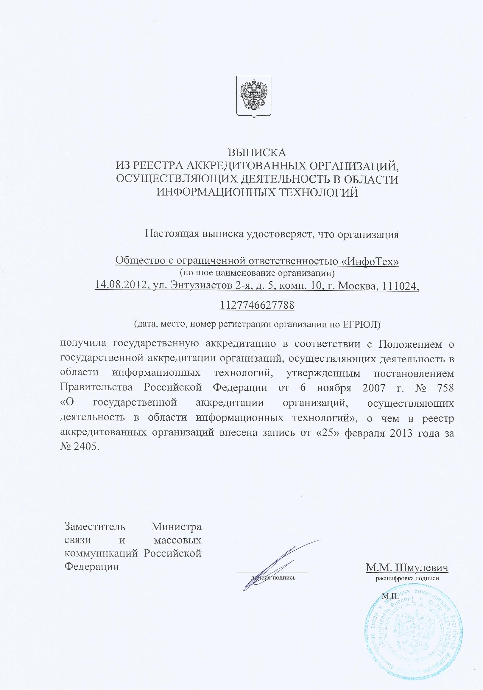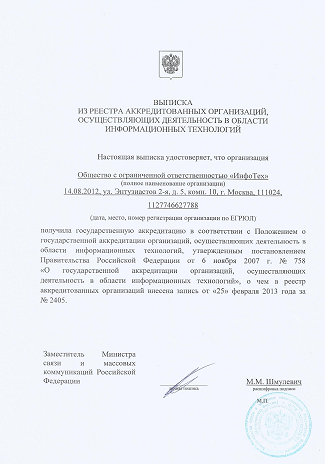 получила государственную аккредитацию в соответствии с Положением о государственной аккредитации организаций, осуществляющих деятельность в области информационных технологий, утвержденным постановлением Правительства Российской Федерации от 6 ноября 2007 г. № 758 «О государственной аккредитации организаций, осуществляющих деятельность в области информационных технологий», о чем в реестр аккредитованных организаций внесена запись от «25» февраля 2013 года за № 2405. Заместитель Министра связи и массовых коммуникаций Российской Федерации